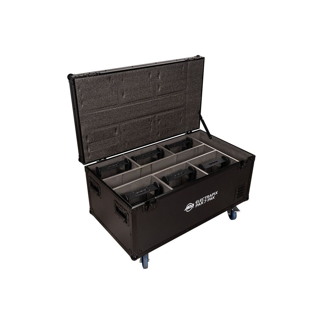 Flightcase ElectraPix Par 7 FC (1 Stück): Das widerstandsfähige Transportcase schützt Ihre Ausrüstung beim Transport und bietet ausreichend Platz für Scheinwerfer, Ladestationen, Fernbedienung und Kabel. Maße (L×B×H): 577 × 1026 × 567 mm.