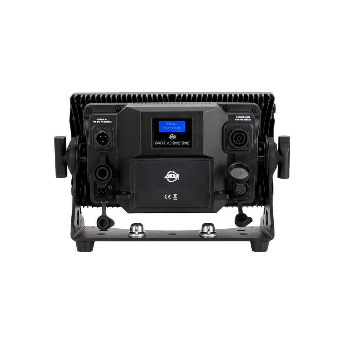 ⦁ Datenein-/-ausgang: IP65-verriegelbarer 5-poliger XLR-Anschluss, DMX-Ein-/-Ausgang (mit Gummischutzabdeckungen über den Anschlüssen)
