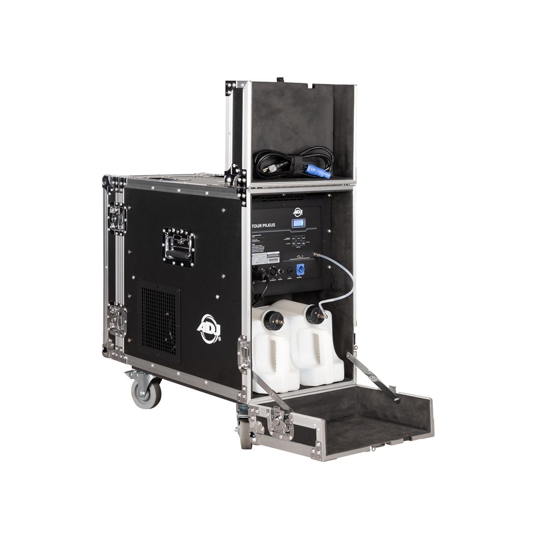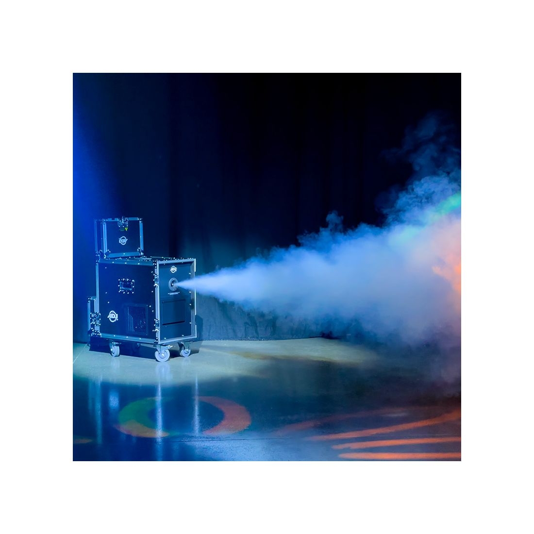 Untergebracht in einem stabilen Flightcase mit arretierbaren Rollen, überzeugt dieses leistungsstarke Gerät durch seine Flexibilität: Es kann wahlweise dichte Nebelstöße oder einen gleichmäßigen, feinen Haze erzeugen – und das mit handelsüblicher, wasserbasierter Nebelfluid.