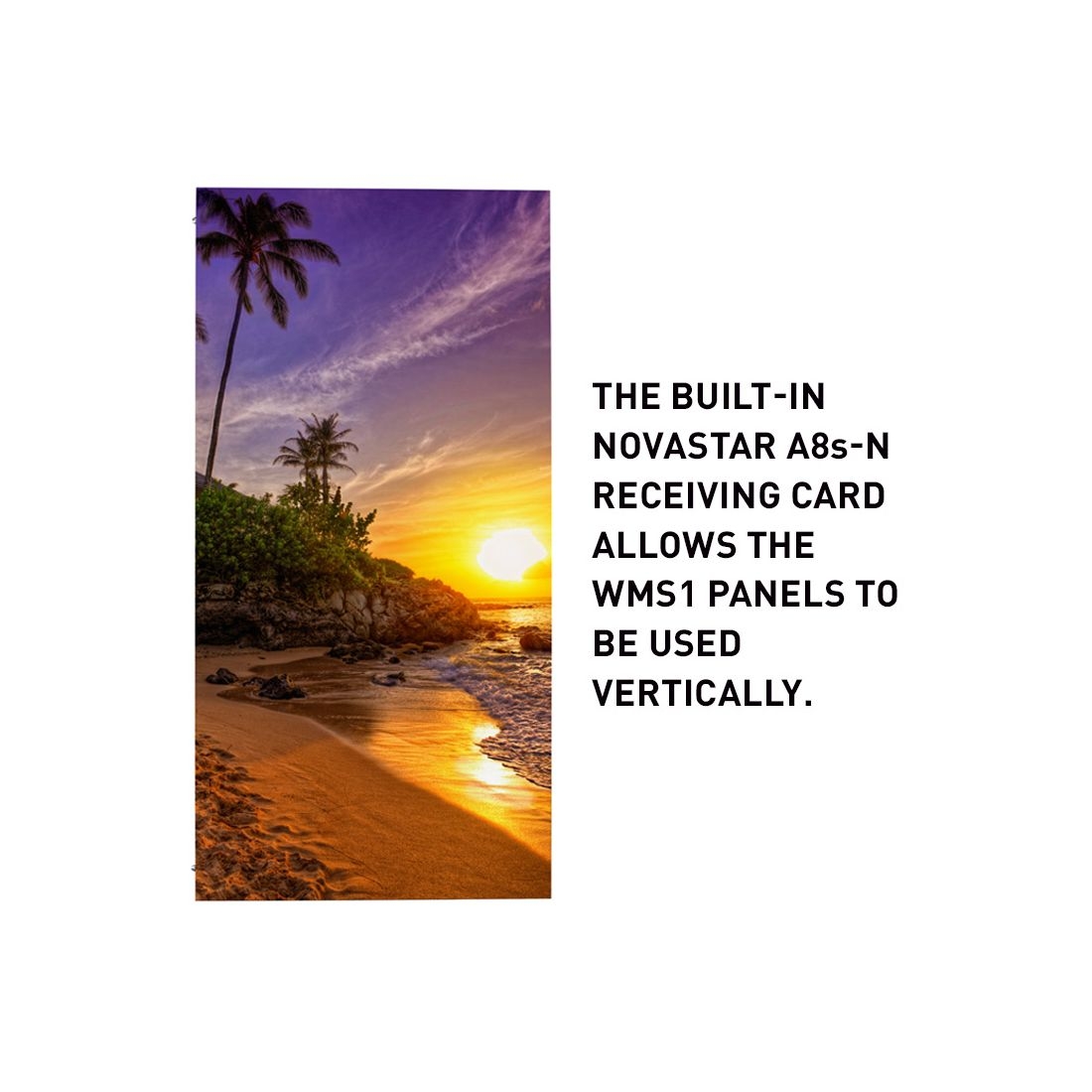 Das Panel misst 1000 × 500 mm, besteht aus acht Modulen à 128 × 128 Pixel, und erreicht eine Gesamtauflösung von 512 × 256 (horizontal) bzw. 256 × 512 (vertikal). Die integrierte Novastar A8s-N-Empfangskarte erlaubt flexible Ausrichtung und einfache Wandmontage. Die Frontwartung ermöglicht schnellen Austausch einzelner Module.