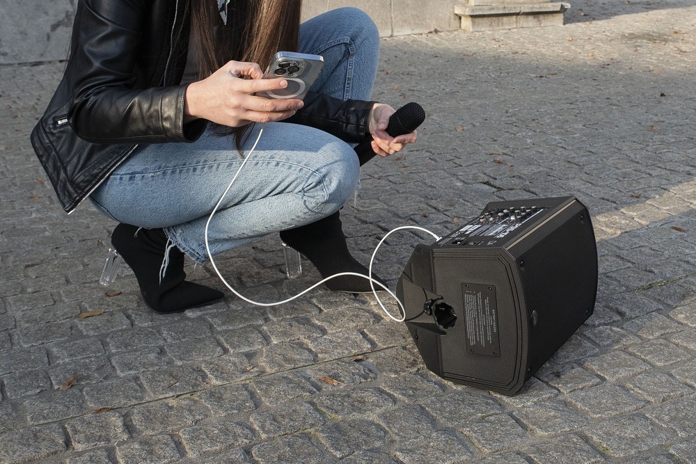Im Inneren arbeitet ein effizienter 2-Kanal Class-D-Verstärker, der den Anschluss von zwei Mikrofonen sowie einer Audioquelle (z. B. USB, Bluetooth oder (Mini-)Klinke) erlaubt. Für noch mehr Flexibilität ist optional ein kabelloses Mikrofonset mit integriertem Empfänger und Beltpack erhältlich – ideal für eine kompakte All-in-One-Lösung.