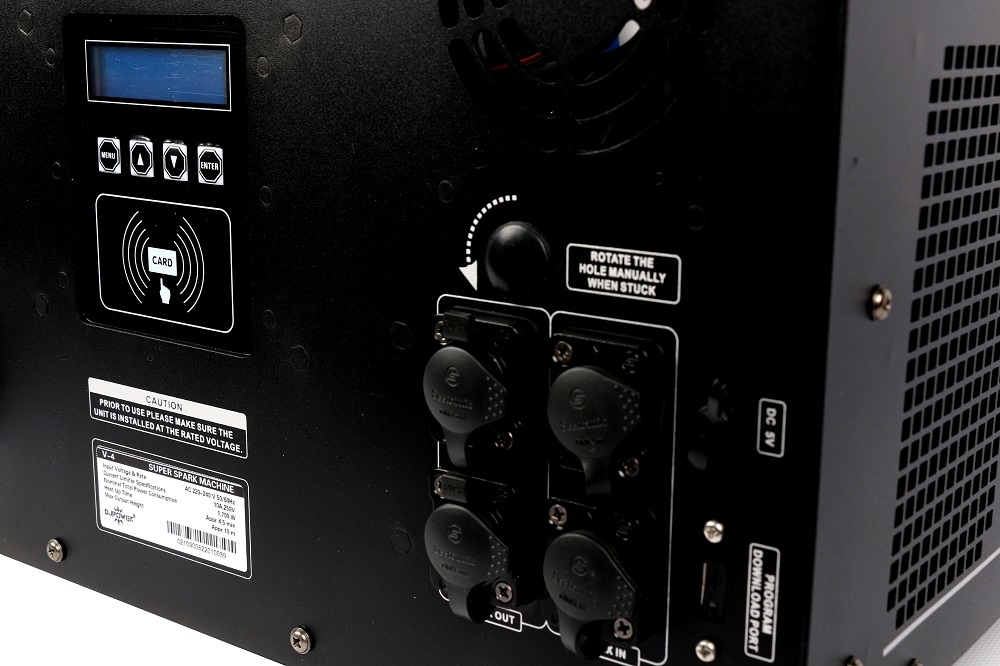 Bei den Fontänen handelt es sich um "kalte" Funken. Für die maximale Sicherheit während des Betriebs zu sorgen schaltet der "Spark" nach 30 Sek. im Dauerauswurf automatisch ab und kann dann wieder aktiviert werden. Mit dem Spark V-4 darf nur das entsprechende DJ Power Granulat verwendet werden. Das Gerät kann mittels DMX512 angesteuert werden. Dafür stehen sind 3+5pol XLR Anschlüsse zur Verfügung. Für die Bedienung des Spark V-4 ist außerdem keinerlei Schein erforderlich, da es sich nicht um Pyrotechnik handelt.