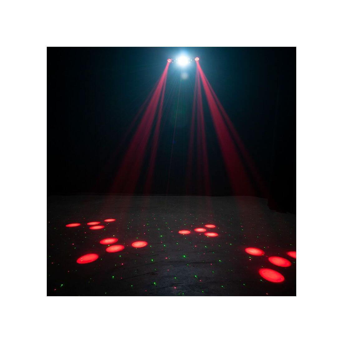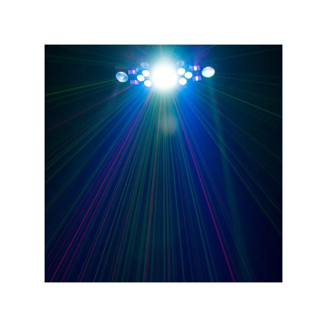 Der neue Furious Five RG von Eliminator bietet eine Beleuchtungslösung aus einer Hand und vereint fünf deutlich unterschiedliche Effekte in einem kompakten Gerät. Dieses einzigartige Gerät ist ideal für mobile Entertainer und Installateure, die in Bars und Clubs mit begrenztem Platzangebot arbeiten. Es erzeugt eine komplette Lichtshow mit Derby- und Laserstrahlen, UV- und Farbwascheffekten sowie Stroboskopeffekten. In der Mitte der Leuchte befindet sich eine Laserblende, die unzählige gebeugte Strahlen projiziert, die von zwei Laserdioden (70 mW grün und 100 mW rot) erzeugt werden. Die Blende ist von 81 weißen SMD 5730-LEDs umgeben, die das Stroboskopelement mit variabler Geschwindigkeit der Lichtshow bilden. Auf jeder Seite dieses zentralen Bereichs befinden sich 6 x 3-Watt-4-in-1-LEDs (rot, grün, blau, weiß), die lebendige Farbverläufe erzeugen, sowie 4 x 3-Watt-CREE-UV-LEDs, die den klassischen „ Schwarzlichteffekt. Schließlich befinden sich auf beiden Seiten des Geräts zwei Derby-Linsen, die jeweils 8 x rote, 6 x grüne, 6 x blaue und 6 x weiße LEDs verwenden, um animierte Punktmuster zu projizieren und ansprechende Effekte in der Luft zu erzeugen.