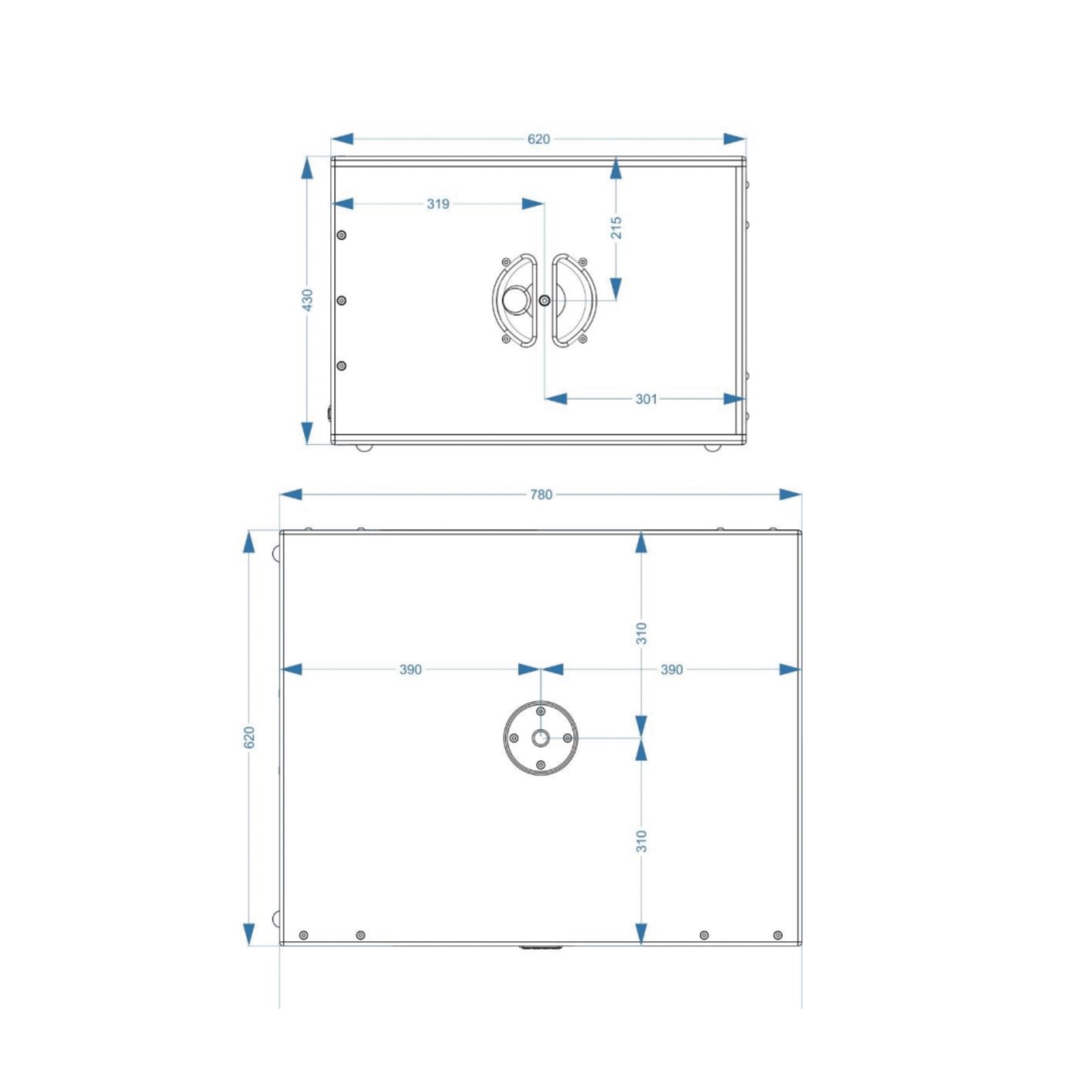 ⦁ Robuste Tragegriffe mit integriertem M20-Lautsprecherstangenadapter.